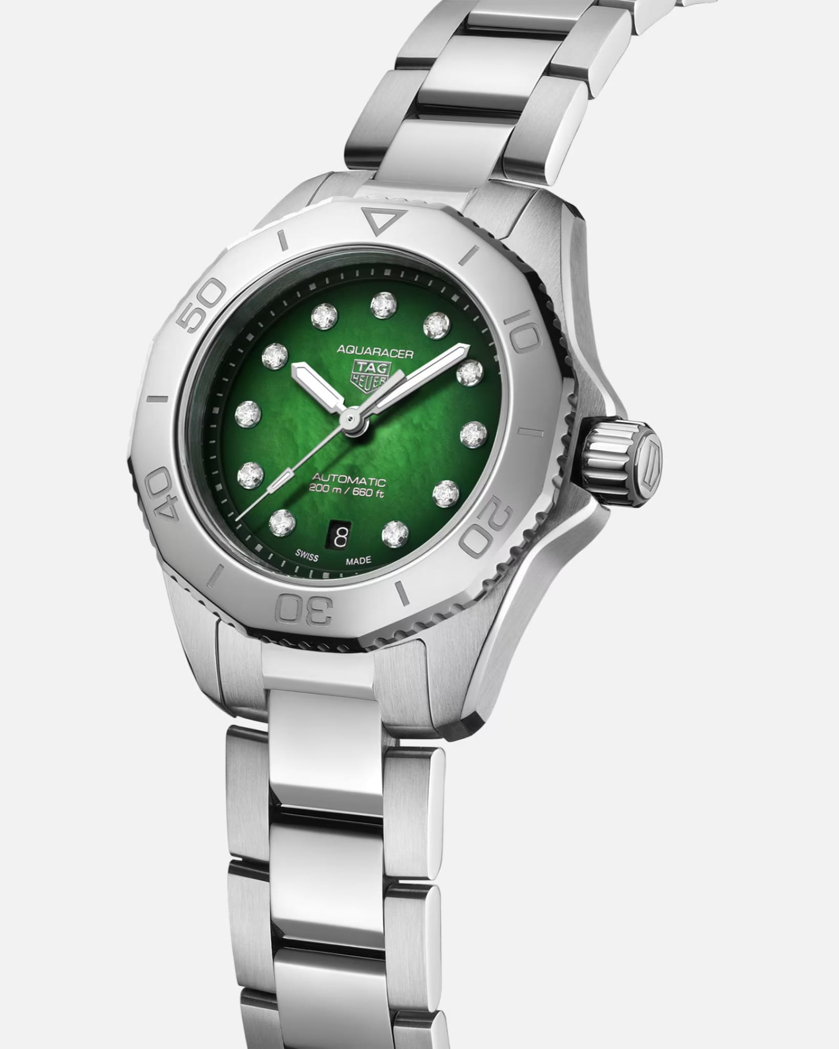 Женские механические швейцарские часы TAG Heuer Aquaracer Professional 200 WBP2415.BA0622, механический механизм (автоматический калибр) с высокой точностью. Сапфировое стеклоСапфировое стеклоПрочный и надёжный материал из кристалла сапфира синтетического происхождения, характеризующийся особой твёрдостью и устойчивостью к царапинам и повреждениям. устойчивое к появлению царапин, обладающее высокой прозрачностью. Класс водозащиты: 200 метров, позволит плавать, нырять и заниматься другими водными видами спорта. Корпус часов изготовлен из стали. Стальной браслет на раскладной застёжкеРаскладная застёжкаТакой тип застёжки используется только на браслетах из металла. Она никогда не раскрывается полностью, происходит разделение на 2 и более частей. Раскладывающая застёжка снизит вероятность потери часов к минимуму.. Изделие дополнено 11 бриллиантами VS классической огранки диаметром 1,40 мм (0,107 карата) в качестве часовых меток. Стрелки с люминесцентным покрытиемЛюминесцентное покрытиеПозволяет считывать показания времени в темноте. Производители наносят на стрелки, часовые индексы, безель или поверхность циферблата светонакопительный состав, дающий холодное свечение.. Окошко даты находится в положении 6 часов.