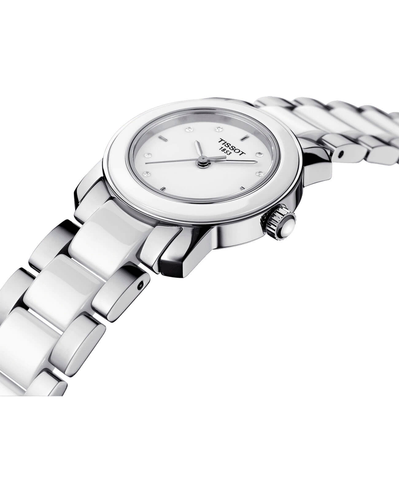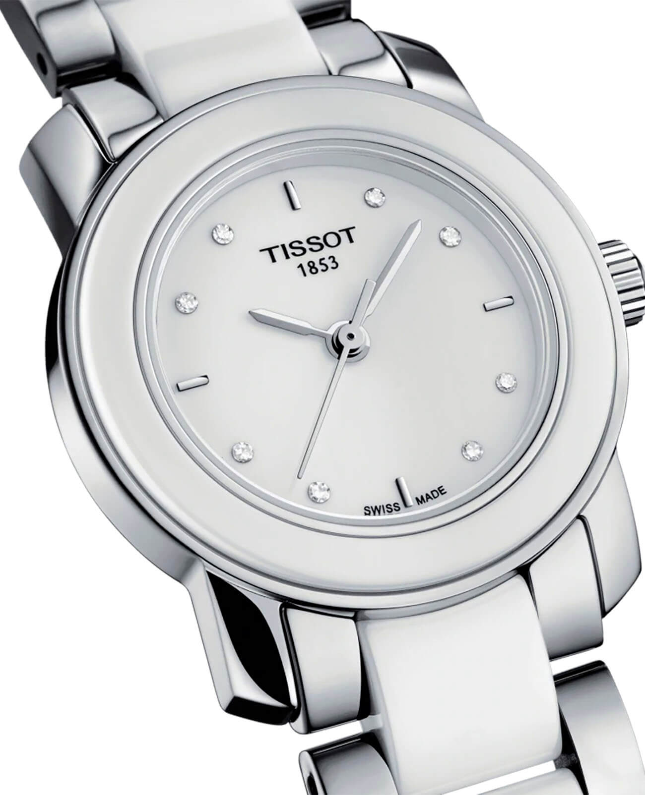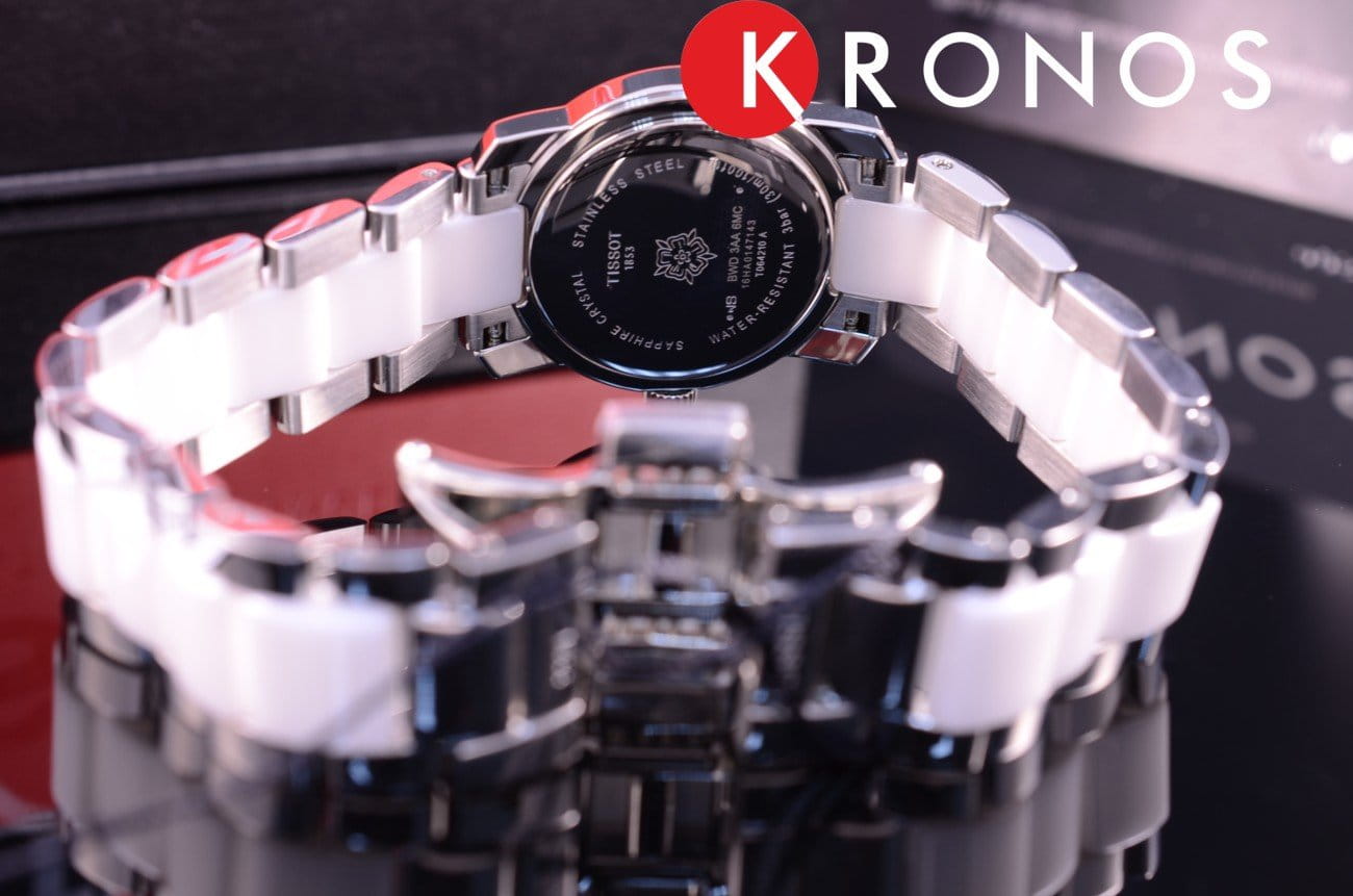 Модель в серебристо-белом оформлении станет изящным украшением к вечернему платью или классическому костюму. Для изготовления часов использовались современные материалы: хирургическая сталь и керамика, отличающаяся гипоаллергенными свойствами. Керамика принимает температурный режим тела человека и обеспечивает комфорт при ношении. Циферблат инкрустирован бриллиантами, имеющими законное происхождение. Кварцевый механизм ETA F03.111. Функция EOLEOLПредставляет собой систему, уведомляющую владельца часов о необходимости замены элемента питания. За 2 недели до полного разряда батарейки секундная стрелка перестаёт ходить чётко и начинает перепрыгивать на 3-4 деления.. Габариты: 28 x 28 x 6,4 мм.