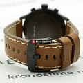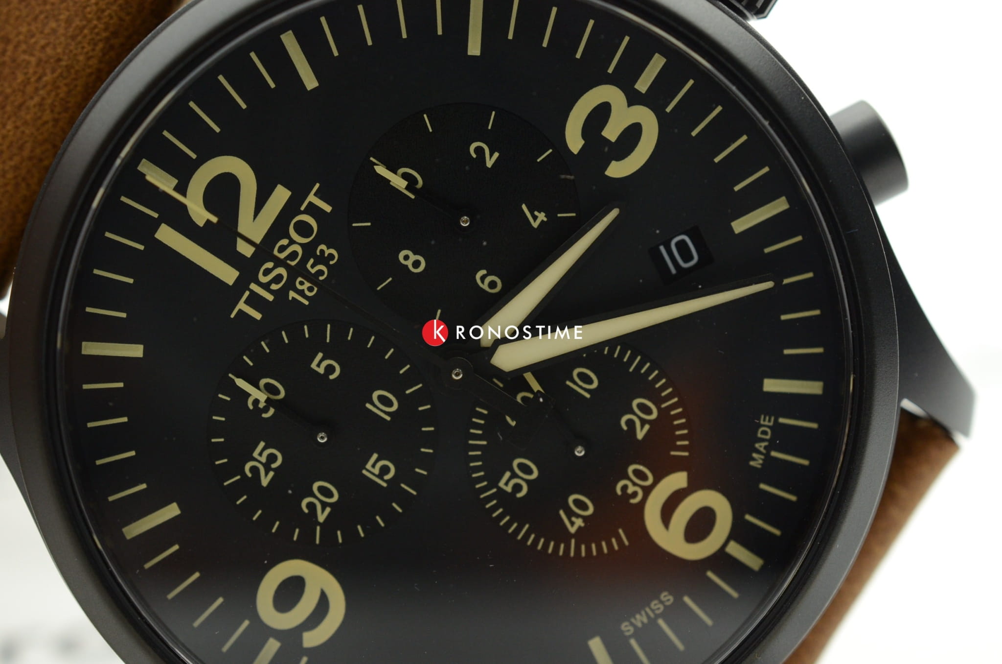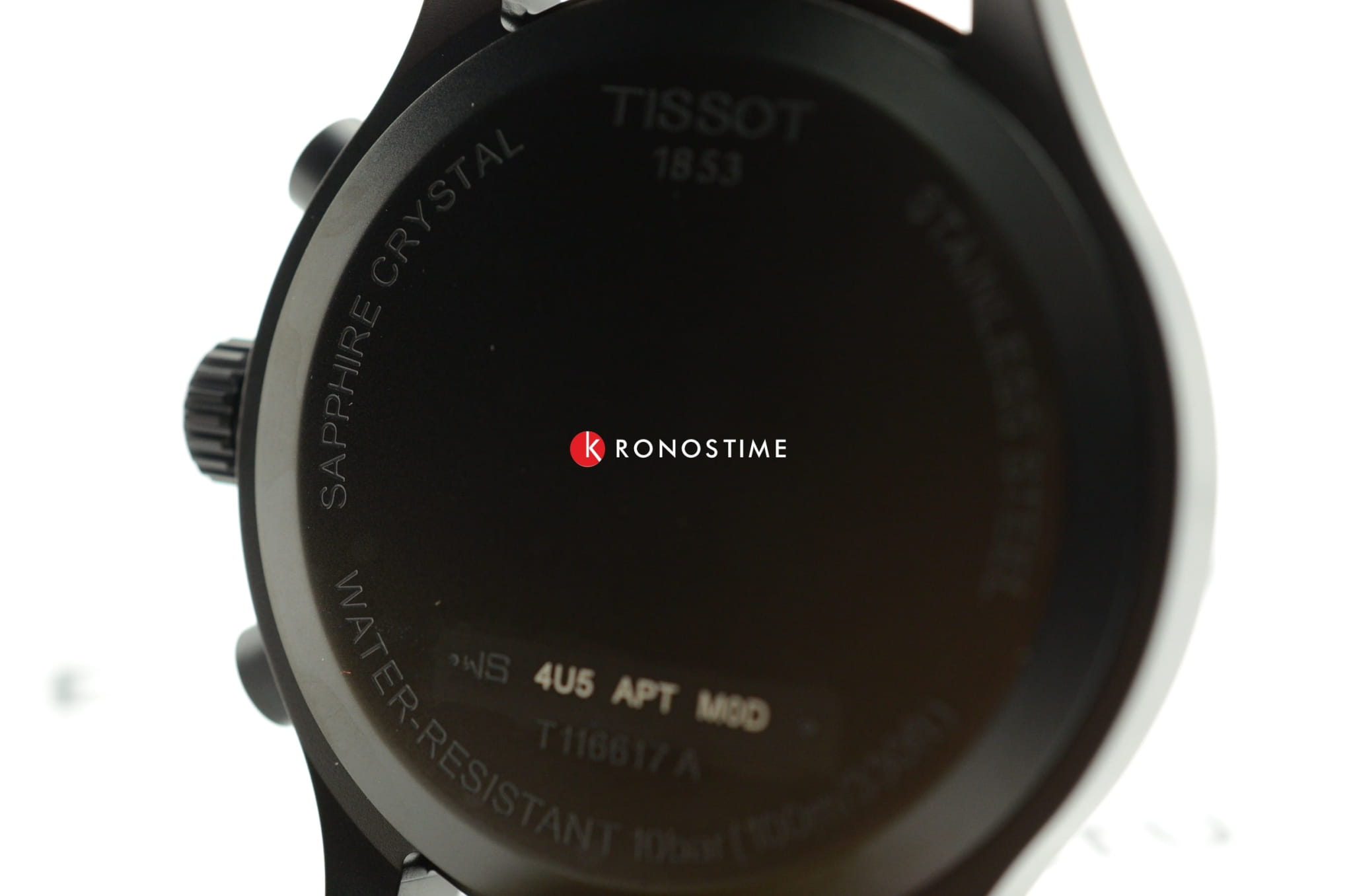 Дизайнеры делают ставку на оригинальный ремешок с характерной прострочкой, он сделан из натуральной кожи. Модель относится к числу самых больших хронографов среди всей продукции Tissot, диаметр их корпуса имеет внушительный размер - 45 мм. Кварцевый калибр ETA G10.212 с 4 камнями. Корпус из хирургической стали с чёрным PVD-покрытием. Хронограф, секундомер, окошко даты. Габариты: 45 x 45 x 11 мм.
