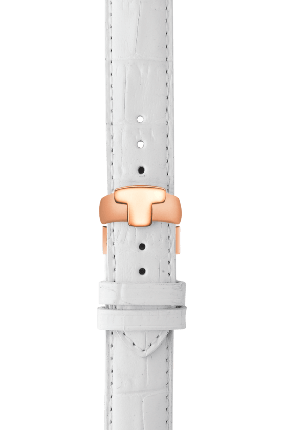 TISSOT Dressport Quartz Chronograph - женские кварцевые наручные часы. Корпус этих часов среднего размера (35 мм) и выполнен из нержавеющей стали L316 с PVD-покрытием цвета розового золота. Модель имеет устойчивое к царапинам сапфировое стекло, ремешок из натуральной кожи белого цвета, перламутровый циферблат. Калибр механизма: ETA G15.211. Класс водозащиты: 30 м / 3 АТМ (защита от брызг и случайных капель). Дополнительные функции и особенности: отображение числа, хронограф (секундомер).