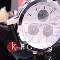 Модель сочетает в себе белый, чёрный, серебристый цвет, подобное исполнение позволяет носить их даже с одеждой самых смелых оттенков. Секундная стрелка выполнена в виде шпаги, необычный узор украшает массивный циферблат с дополнительными счётчиками хронографаХронографФункция позволяет измерять отрезки времени с особой точностью: часы, минуты, секунды. Верным признаком хронографа является наличие на циферблате 3 дополнительных окошек-счётчиков.. Кварцевый калибр ETA G10.211 с 4 камнями. Ремешок из натуральной кожи с тиснением под кожу крокодила. Стальной ударопрочный корпус. Хронограф, тахиметрТахиметрРазмеченная шкала, располагается на ободке или безеле часов. Тахиметр позволяет рассчитать скорость на определённом участке пути, расстояние измеряется в километрах или милях., секундомер, дата. Габариты: 41 x 42 x 12 мм.