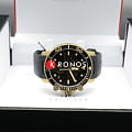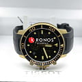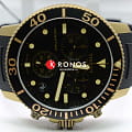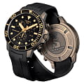 Наручные часы отличаются спортивным дизайном, прослеживается дайверская тематика, чему способствует и водонепроницаемость при давлении 30 бар на глубине 300 метров. Цветовая гамма сдержанная, но оттенки играют благодаря чёрному PVD-покрытию безеляБезельВнешний ободок, закрепляющий стекло. В спортивных часах так называется поворотное кольцо с делениями на циферблате, выполняет роль таймера – замеряет отрезки времени на шкале. Неподвижный безель – элемент декора. Однонаправленно вращающийся безель на дайверских часах позволяет фиксировать моменты погружения и выныривания на поверхность. и PVD-покрытиюPVDУльтратонкое покрытие наносится в технике вакуумного напыления, сочетает в себе нитрид титана особой прочности со слоем золота или оксида хрома. Несёт в себе декоративную или защитную функцию. корпуса под цвет состаренной бронзы. Кварцевый механизм ETA G10.212. Сапфировое стекло с антибликовым покрытием. Завинчивающаяся заводная головка и задняя крышка. Люминесцентная подсветкаЛюминесцентное покрытиеПозволяет считывать показания времени в темноте. Производители наносят на стрелки, часовые индексы, безель или поверхность циферблата светонакопительный состав, дающий холодное свечение.. Секундомер, хронографХронографФункция позволяет измерять отрезки времени с особой точностью: часы, минуты, секунды. Верным признаком хронографа является наличие на циферблате 3 дополнительных окошек-счётчиков., календарь. Габариты: 45 x 45 x 12,8 мм.