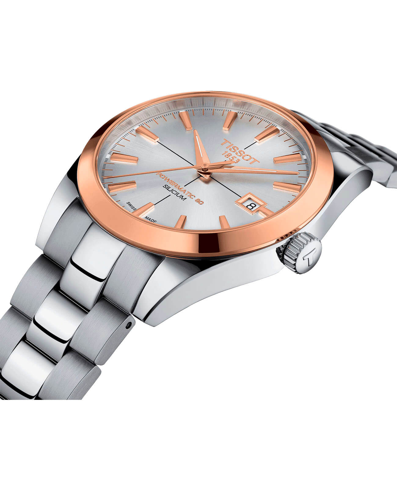 Классический облик модели всегда будет в моде, легкий оттенок роскошного стиля придаёт безельБезельВнешний ободок, закрепляющий стекло. В спортивных часах так называется поворотное кольцо с делениями на циферблате, выполняет роль таймера – замеряет отрезки времени на шкале. Неподвижный безель – элемент декора. Однонаправленно вращающийся безель на дайверских часах позволяет фиксировать моменты погружения и выныривания на поверхность. из 18-каратного розового золота. Уникальный автоматический механизм Powermatic 80 SiliciumPowermatic 80 SiliciumМеханизм обладает самой высокой точностью хода за всю историю Tissot. Дополняется уникальной кремниевой спиралью, минимизирующей воздействие магнитных полей и перепада температур. Сохраняется запас хода до 80 часов благодаря удлиненной заводной пружине и снижению трения в системе спуска. обеспечивает высокую точность хода. Работа движущихся деталей просматривается сквозь прозрачную заднюю крышку корпуса. Нержавеющая сталь 316L, устойчивая к повреждениям. Люминесцентная подсветкаЛюминесцентное покрытиеПозволяет считывать показания времени в темноте. Производители наносят на стрелки, часовые индексы, безель или поверхность циферблата светонакопительный состав, дающий холодное свечение.. Антибликовое покрытие. . Апертура даты. Габариты: 40 x 40 x 10,6 мм.