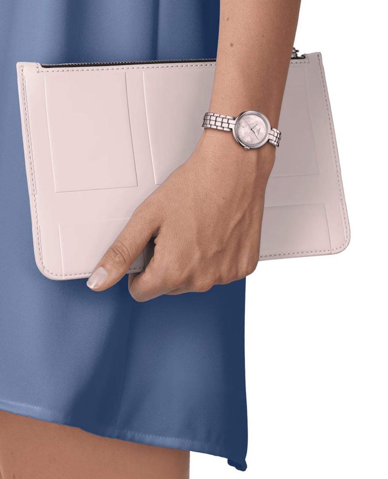 Швейцарские женские часы Tissot Flamingo T094.210.11.116.02, кварцевый механизм с высокой точностью. Корпус часов изготовлен из нержавеющей стали. Циферблат украшен бриллиантами. Окошко даты находится в положении 6 часов. Класс водозащиты: 50 метров, позволит защитить корпус от случайных брызг или капель дождя. Стальной браслет на застёжке-бабочке с кнопкамиЗастёжка "бабочка"Такой вид застёжки дополняется предохранителями, помогающими избежать случайного раскрытия браслета. Обладают изящным исполнением. .