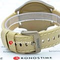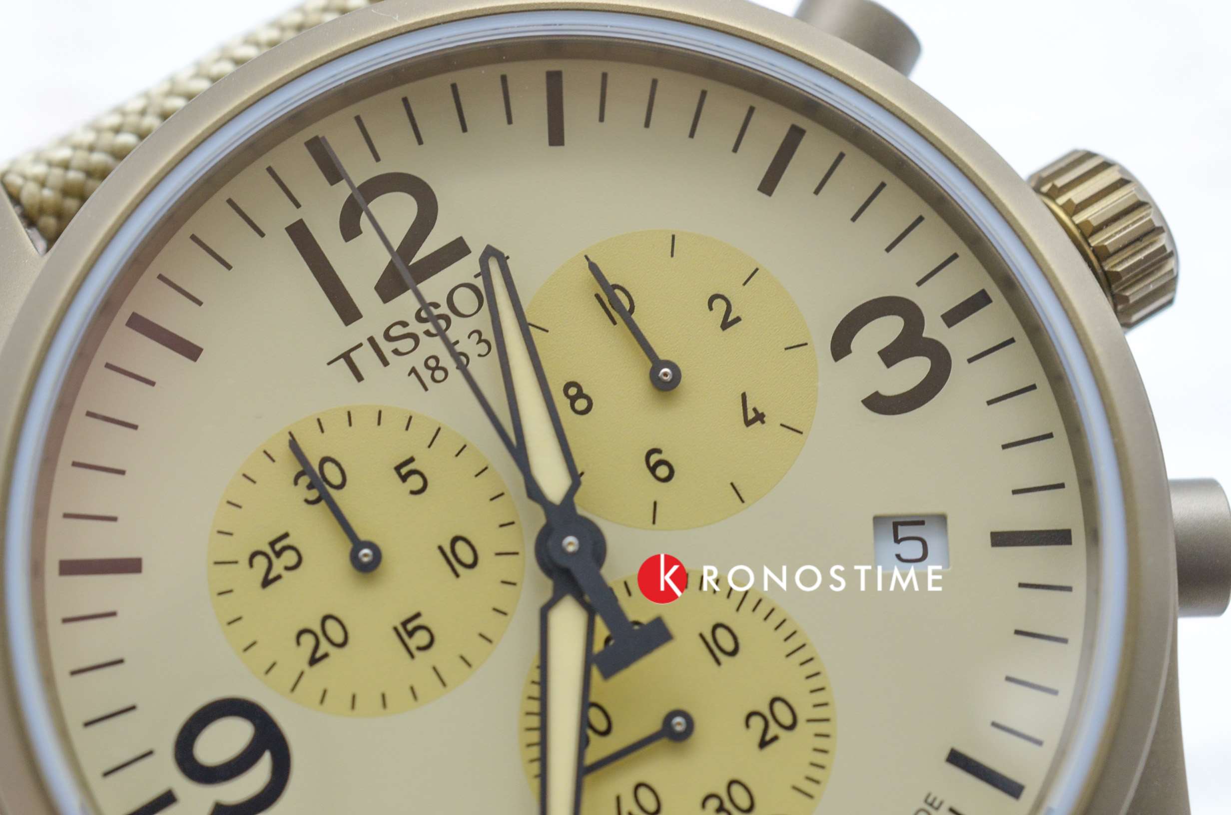 Модель выполнена в лаконичном бежевом цвете, исключение составляет PVD-покрытиеPVDУльтратонкое покрытие наносится в технике вакуумного напыления, сочетает в себе нитрид титана особой прочности со слоем золота или оксида хрома. Несёт в себе декоративную или защитную функцию. корпуса оттенка хаки. Циферблат дополнен арабскими цифрами и миниатюрными счётчиками хронографа. Тканевый ремешок красиво смотрится на запястье, материал обеспечивает комфортное ношение. Высокоточный кварцевый механизм ETA G10.212. Водонепроницаемость при давлении 10 бар. Люминесцентная подсветкаЛюминесцентное покрытиеПозволяет считывать показания времени в темноте. Производители наносят на стрелки, часовые индексы, безель или поверхность циферблата светонакопительный состав, дающий холодное свечение. стрелок. ХронографХронографФункция позволяет измерять отрезки времени с особой точностью: часы, минуты, секунды. Верным признаком хронографа является наличие на циферблате 3 дополнительных окошек-счётчиков., секундомер, отображение текущего числа. Габариты: 45 x 45 x 11 мм.