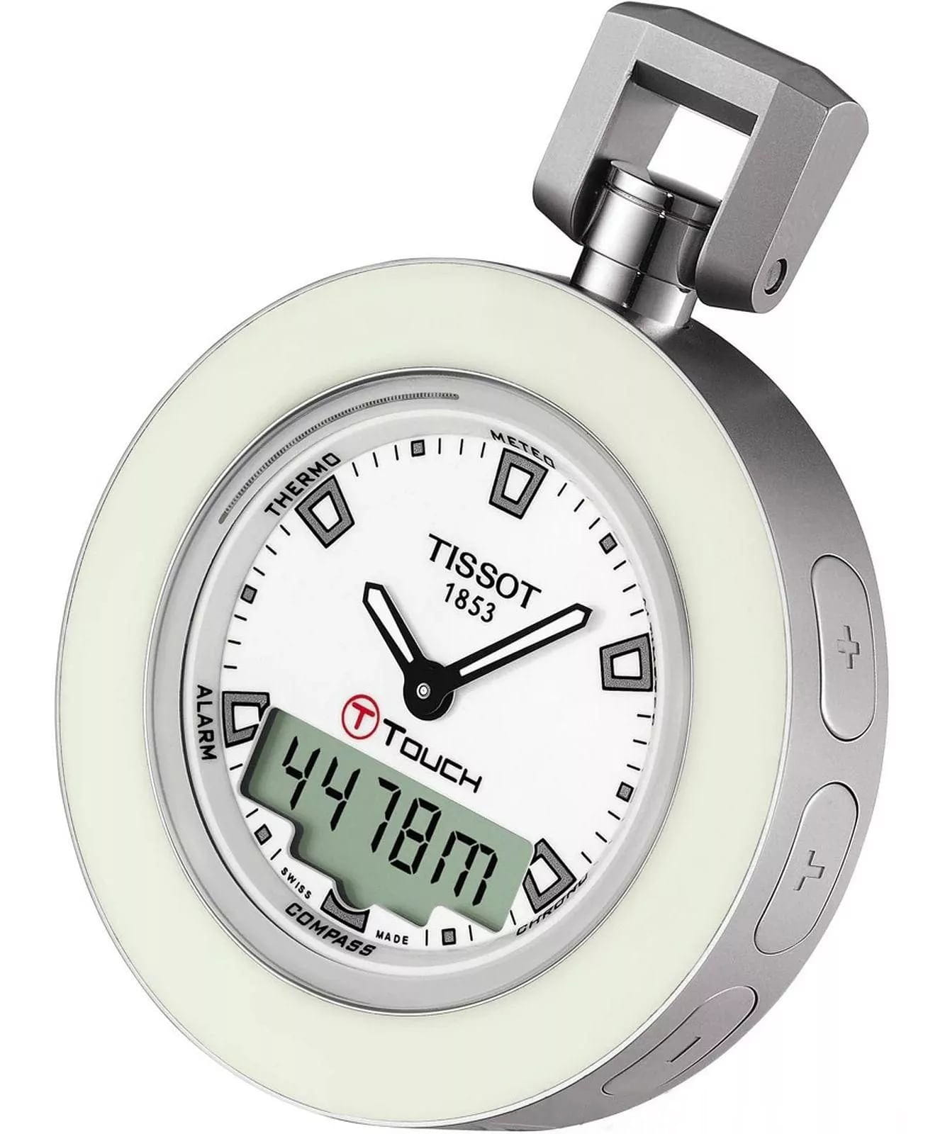 Tissot T-Pocket Touch T857.420.19.011.00 — это многофункциональные карманные часы. Модель состоит из серебристо-бежевой нержавеющей стали и белого циферблата, защищенного сапфировым стекломСапфировое стеклоПрочный и надёжный материал из кристалла сапфира синтетического происхождения, характеризующийся особой твёрдостью и устойчивостью к царапинам и повреждениям., на котором расположен дисплей. Через него можно использовать будильникБудильникБуди́льник — часы, в заданный момент времени подающие звуковой, световой и/или в редких случаях другой сигнал., GMTGMTОтображение времени второго часового пояса.Такая функция особенно актуальна для путешественников и бизнесменов,которые общаются с людьми из разных стран,теперь вы всегда будете знать,какой час у вашего партнёра или близкого человека., барометр, второй часовой поясВторой часовой поясФункция, позволяющая отображать время двух часовых поясов одновременно., термометр, высотомер, секундомерСекундомерСекундоме́р — прибор, способный измерять интервалы времени с точностью до долей секунды., хронографХронографФункция позволяет измерять отрезки времени с особой точностью: часы, минуты, секунды. Верным признаком хронографа является наличие на циферблате 3 дополнительных окошек-счётчиков., шагомерШагомерШагоме́р или педо́метр — измерительный прибор для подсчёта количества сделанных шагов (или пар шагов) при ходьбе или беге., вечный календарьВечный календарьКлассическое часовое усложнение, представляющее собой календарь, рассчитанный на несколько лет вперёд (стандартно – до 2099 года). Определяет текущую дату, день недели, месяц., мировое времяМировое время Полезное часовое усложнение, отображающее время в основных городах и известных областях по всему миру, оно связано с часовыми поясами, удобно для путешественников и бизнесменов. . БезельБезельВнешний ободок, закрепляющий стекло. В спортивных часах так называется поворотное кольцо с делениями на циферблате, выполняет роль таймера – замеряет отрезки времени на шкале. Неподвижный безель – элемент декора. Однонаправленно вращающийся безель на дайверских часах позволяет фиксировать моменты погружения и выныривания на поверхность. с PVD-покрытиемPVDУльтратонкое покрытие наносится в технике вакуумного напыления, сочетает в себе нитрид титана особой прочности со слоем золота или оксида хрома. Несёт в себе декоративную или защитную функцию.. Класс водозащиты: 100 метров, позволит плавать, нырять и заниматься другими водными видами спорта. Часы имеют EOLEOLПредставляет собой систему, уведомляющую владельца часов о необходимости замены элемента питания. За 2 недели до полного разряда батарейки секундная стрелка перестаёт ходить чётко и начинает перепрыгивать на 3-4 деления.. Стрелки и метки с люминесцентным покрытиемЛюминесцентное покрытиеПозволяет считывать показания времени в темноте. Производители наносят на стрелки, часовые индексы, безель или поверхность циферблата светонакопительный состав, дающий холодное свечение..