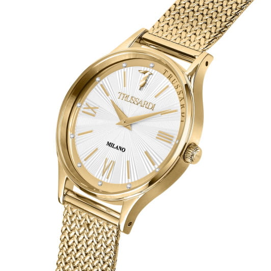 Итальянские женские часы Trussardi T-Star R2453152502 - это стильный женский аксессуар, который сочетает элегантный дизайн и практичность. Корпус выполнен из нержавеющей стали с IP-покрытиемIP-покрытиеМетод ионного напыления. Демонстрирует повышенную устойчивость к истиранию, окислению и химическим веществам. Под воздействием высокого давления и температуры около 1500°C молекулы металла надёжно соединяются с частицами корпуса часов., что обеспечивает долговечность и утончённый внешний вид. Надежное минеральное стеклоМинеральное стеклоМинеральное стекло представляет собой искусственно выращенный минерал кварца. Такое стекло отличается особой устойчивостью к повреждениям и царапинам. Уступает по некоторым качествам сапфировому стеклу. защищает циферблат от царапин и обеспечивает долговечность. Циферблат украшен кристаллами. Модель оснащена кварцевым механизмом, обеспечивающим высокую точность хода. Браслет из нержавеющей стали с IP-покрытиемIP-покрытиеМетод ионного напыления. Демонстрирует повышенную устойчивость к истиранию, окислению и химическим веществам. Под воздействием высокого давления и температуры около 1500°C молекулы металла надёжно соединяются с частицами корпуса часов. с раскладным замкомРаскладной замокДанный вариант застежки используется только на часах с металлическим браслетом. Отличительная особенность такого крепления в том, что длина браслета становится универсальной и вы можете самостоятельно отрегулировать нужный вам размер – застежка просто двигается по браслету часов. обеспечивает комфортное ношение. Водозащита 50 метров позволит защитить корпус от случайных брызг или капель дождя. Эта модель – отличный выбор для тех, кто ищет сочетание стиля, качества и функциональности. Часы станут не только полезным аксессуаром, но и выразительным элементом вашего имиджа.