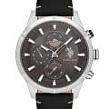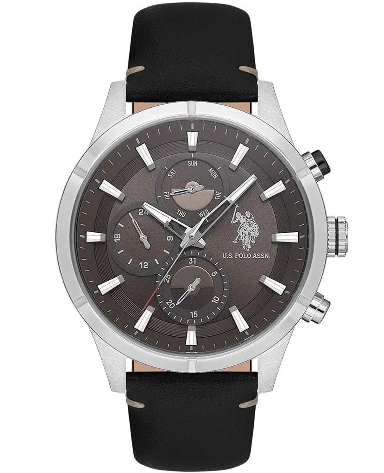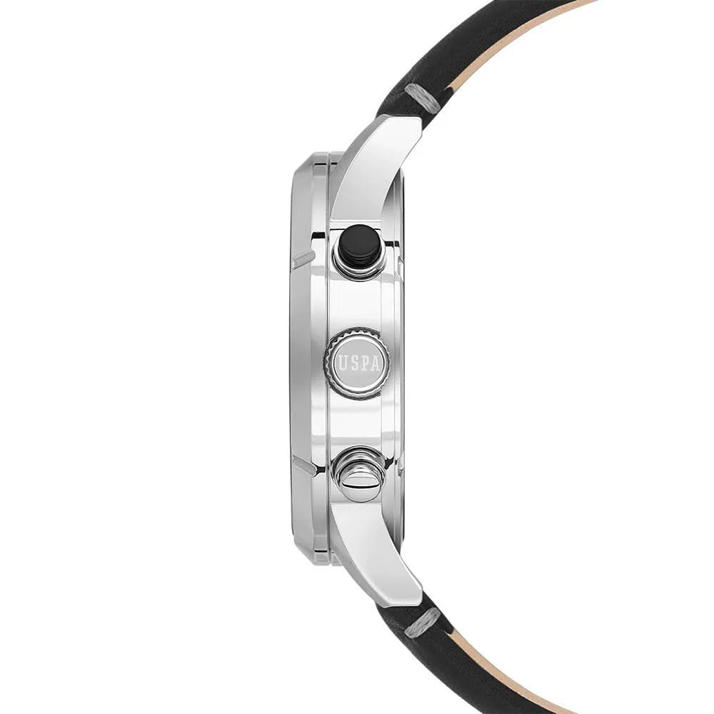 Мужские часы U.S. Polo Assn. Crossing USPA1014B-07, кварцевый механизм с высокой точностью. Минеральное стеклоМинеральное стеклоМинеральное стекло представляет собой искусственно выращенный минерал кварца. Такое стекло отличается особой устойчивостью к повреждениям и царапинам. Уступает по некоторым качествам сапфировому стеклу. устойчивое к появлению царапин, обладающее высокой прозрачностью. Корпус изготовлен из нержавеющей стали. На циферблате три дополнительных индикатора. Центральные часовая, минутная и секундная стрелки. Индикация даты и дня недели. 12/24х часовой формат времени. Стрелки и метки с люминесцентным покрытиемЛюминесцентное покрытиеПозволяет считывать показания времени в темноте. Производители наносят на стрелки, часовые индексы, безель или поверхность циферблата светонакопительный состав, дающий холодное свечение.. Класс водозащиты: 50 метров, позволит защитить корпус от случайных брызг или капель дождя. Кожаный ремешок черного цвета.