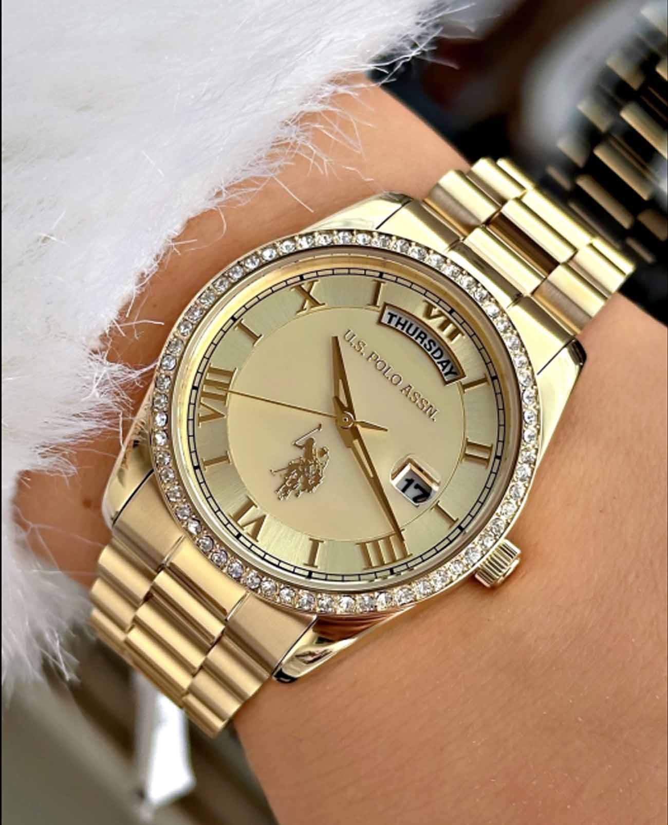 Женские часы U.S. Polo Assn Stile USPA2054-03, кварцевый механизм с высокой точностью. Минеральное стеклоМинеральное стеклоМинеральное стекло представляет собой искусственно выращенный минерал кварца. Такое стекло отличается особой устойчивостью к повреждениям и царапинам. Уступает по некоторым качествам сапфировому стеклу. устойчивое к появлению царапин, обладающее высокой прозрачностью. Корпус изготовлен из нержавеющей стали с IP-покрытиемIP-покрытиеМетод ионного напыления. Демонстрирует повышенную устойчивость к истиранию, окислению и химическим веществам. Под воздействием высокого давления и температуры около 1500°C молекулы металла надёжно соединяются с частицами корпуса часов.. БезельБезельВнешний ободок, закрепляющий стекло. В спортивных часах так называется поворотное кольцо с делениями на циферблате, выполняет роль таймера – замеряет отрезки времени на шкале. Неподвижный безель – элемент декора. Однонаправленно вращающийся безель на дайверских часах позволяет фиксировать моменты погружения и выныривания на поверхность. украшен кристаллами. Окошко даты находится в положении 3 часа. Класс водозащиты: 30 метров, позволит защитить корпус от случайных брызг или капель дождя. Стальной браслет с IP-покрытиемIP-покрытиеМетод ионного напыления. Демонстрирует повышенную устойчивость к истиранию, окислению и химическим веществам. Под воздействием высокого давления и температуры около 1500°C молекулы металла надёжно соединяются с частицами корпуса часов. на застёжке-бабочке с кнопкамиЗастёжка "бабочка"Такой вид застёжки дополняется предохранителями, помогающими избежать случайного раскрытия браслета. Обладают изящным исполнением. .
