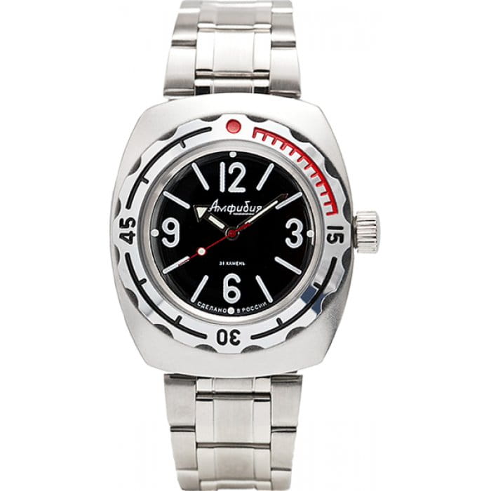 Эти практичные часы великолепно сидят на руке и позволят вам чувствовать себя уверенно в любой обстановке. Амфибия Классика. В механизме 31 камень, частота 19800 полуколебаний в час. Запас хода 31 час. Противоударное устройство оси баланса. Браслет с раскладывающейся застежкой.