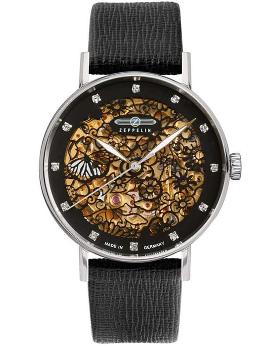 Женские наручные часы Zeppelin Princess of the Sky 7461-2 сочетают в себе элегантный дизайн и точность автоматического механизма. Модель обладает круглым корпусом диаметром 36 мм, изготовленным из нержавеющей стали, что обеспечивает высокую устойчивость к внешним воздействиям. Браслет выполнен из чёрной кожи с классической застежкой, гарантирующей комфортное ношение и стильный внешний вид. Циферблат скелетонирован, открывая взору механизм с 21 драгоценным камнем, и украшен тонкими узорчатыми деталями, добавляющими особый шарм и элегантность. Для защиты используется минеральное стеклоМинеральное стеклоМинеральное стекло представляет собой искусственно выращенный минерал кварца. Такое стекло отличается особой устойчивостью к повреждениям и царапинам. Уступает по некоторым качествам сапфировому стеклу. с антибликовое покрытиеАнтибликовое покрытиеСлой оксида металла в 0,13-0,3 микрон, благодаря которому стекло часов не бликует и не отражает свет. Антибликовое покрытие уменьшает отражение света в 10 раз, обеспечивая отличную читаемость показателей циферблата., обеспечивающее прочную защиту от царапин и отличную видимость циферблата. Часы работают на автоматическом механизме Citizen-Miyota 8N24G с запасом хода около 40 часов и частотой работы 21600 а/h, который не требует замены батареек и заряжается за счет движения руки. Водонепроницаемость часов достигает 5 атмосфер (50 метров), что позволяет использовать их в повседневной жизни, но не рекомендуется для плавания или дайвинга.